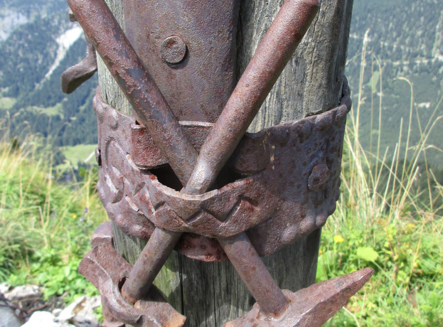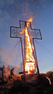 2014: Ein nächtliches Sonnwend-feuer erleuchtet das kunstvoll geschmiedete Kreuz. Das florale Muster ist das Werk von Lehrlingen des Metall-betriebs Hilti, der im Dorf Thüringen am Ausgang des Großen Walsertals liegt. Sie arbeiteten vor gut 50 Jahren unter Anleitung von Meister Ferdinand Simliger – ihre Namen aber sind unbekannt.
